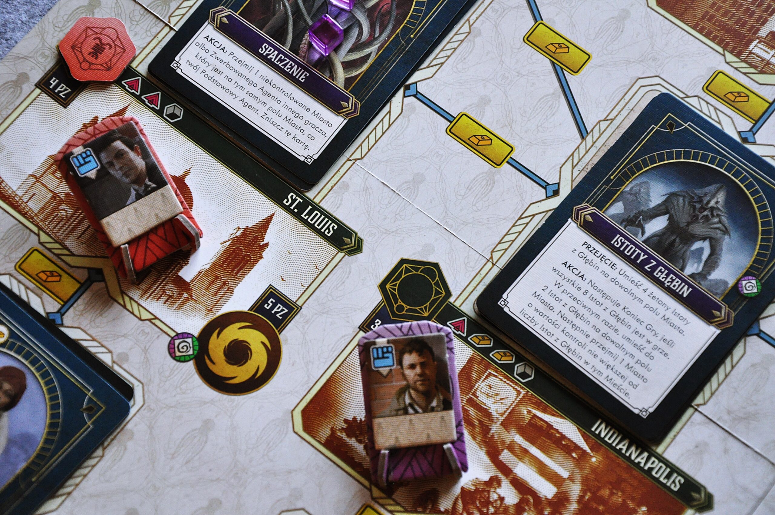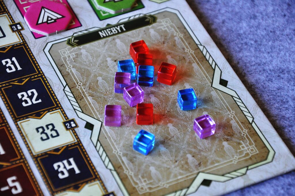 W swoim ruchu możemy również wydawać sztabki złota, aby przemieszczać agentów po planszy lub skupować kostki ze wspólnej puli. Z kolei dzięki zielonym i czerwonym strzałkom mamy możliwość manipulowania punktacją na torze śledztwa lub rytuału.