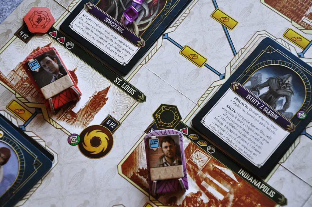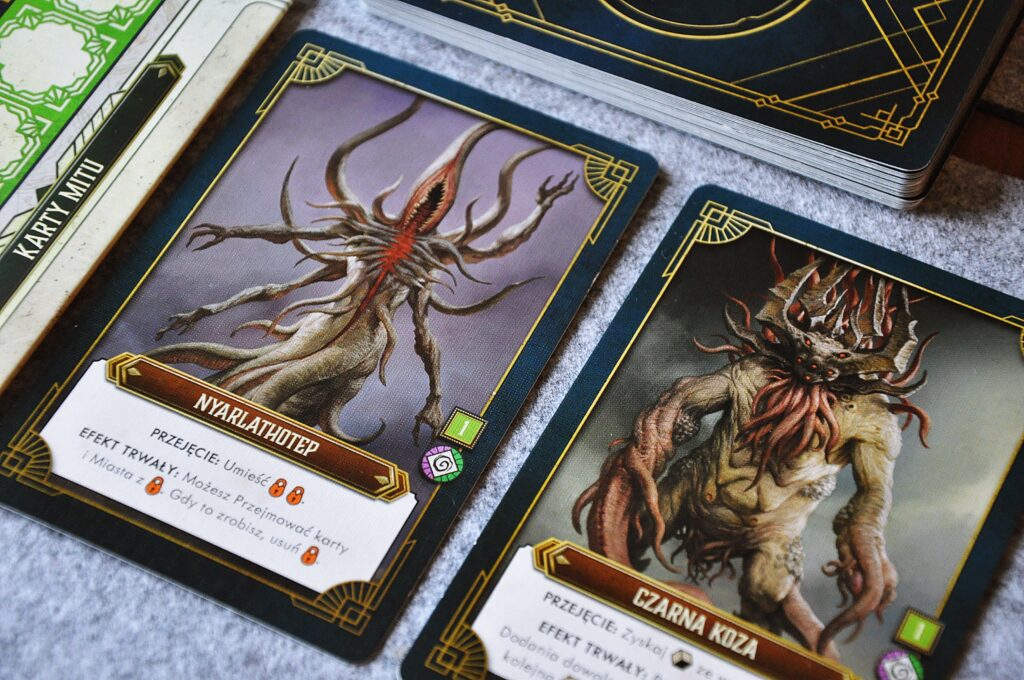 Losowość jest tu mocno ograniczona. Najbardziej może rzucać się przy tym jakie karty wylądują na planszy czy w puli Mitów. Również przy losowaniu żetonów szaleństwa, jednak tutaj sami decydujemy czy podejmiemy się tego poprzez przejmowanie określonych kart.