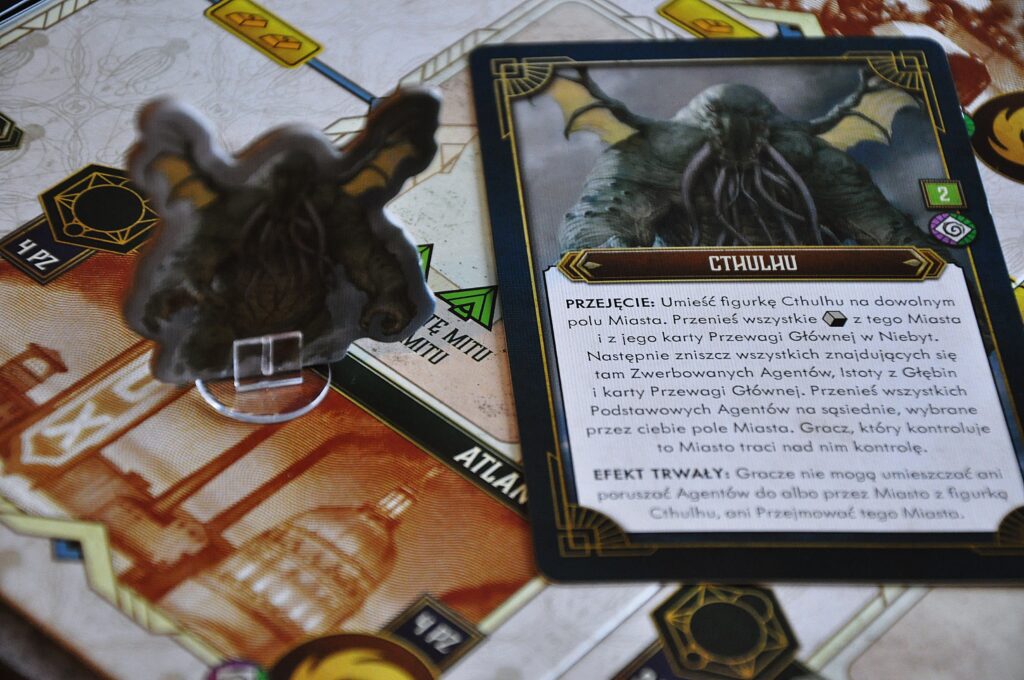 Co wypada tutaj dobrze, to zdecydowanie tempo rozgrywki. Mamy do wykonania 2 akcje, które raczej nie zajmą nigdy zbyt wiele czasu. Nawet najwięksi myśliciele przy planszy szybko uwiną się z tematem. Ledwo dobierzemy nasze karty na koniec tury, a już będziemy musieli myśleć nad ich wykorzystaniem. Ponadto gra za każdym razem układać się będzie nieco inaczej z racji dostępności kart Mitów, czy Przewagi na planszy. Raz bardziej skorzystamy z tych pierwszych kiedy zaroi się nimi w puli, niczym kultystów na ceremonii. Innym razem naszym obiektem zainteresowania będą cenne karty Przewagi, wśród których znajdziemy okazje do punktowania. Najbardziej pewnym źródłem punktów zawsze będą karty Miast, jednak i to nie zawsze przyniesie nam zwycięstwo i warto rozważać również alternatywne ścieżki. Zmusza to za każdym razem do budowania innej talii i przyjmowania różnych strategii.