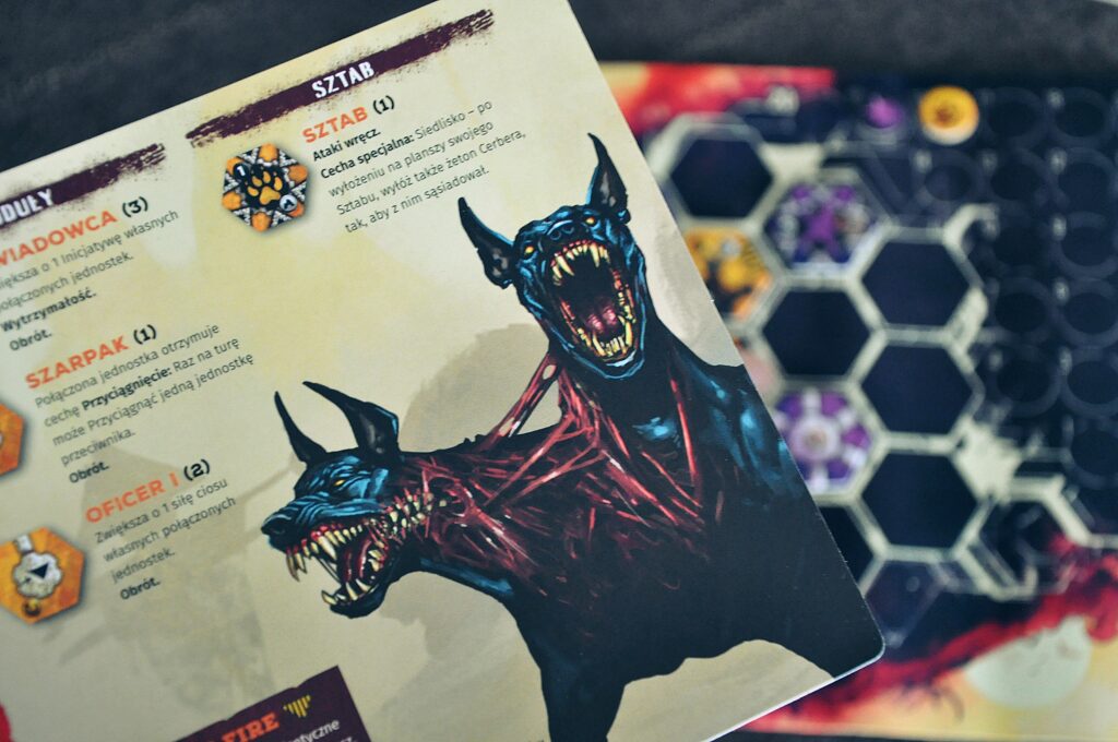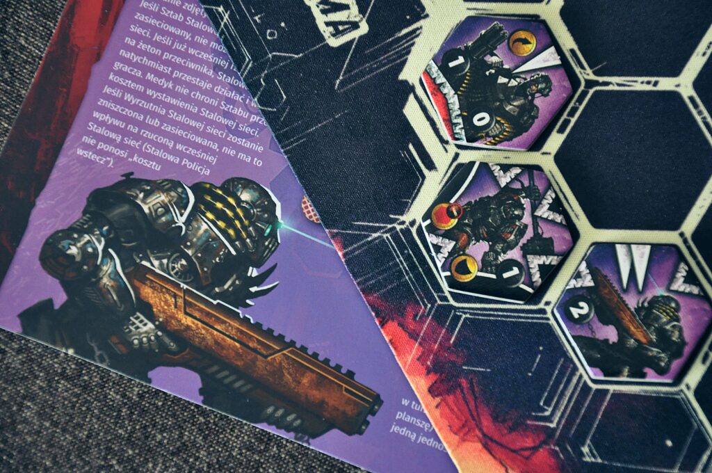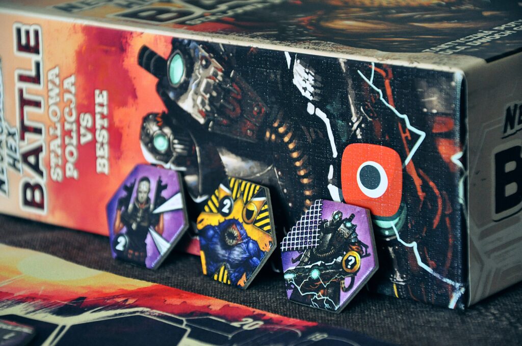 W pudełku z “Neuroshima Hex BATTLE” dostajemy do dyspozycji 2 armie: Stalową Policję oraz Bestie. Trzeba przyznać, że obie frakcje świetnie oddają surowy i brutalny klimat postapokaliptycznej rzeczywistości, niczym w grze “Fallout”. Pozwala to dobrze poznać charakter całego uniwersum już przy pierwszym kontakcie z zestawem kompaktowym gry. Bestie, jak to krwiożercze mutanty, charakteryzują się nieskrępowaną siłą ataku. Nie stanowią regularnej armii, a bardziej stado walczących o teren potworów. Oddano to poprzez wprowadzenie zasady “friendly fire” w ich armii, co powoduje że obrażenia zadawane przez ich wojowników mogą także ranić sojusznicze oddziały. Stalowa policja to natomiast grupa fanatyków bezwzględnie strzegąca ustanowionego przez nich porządku. Doskonale sprawdzają się w szybkich uderzeniach, czy kontroli pola bitwy za pomocą stalowej sieci wypuszczanej przez ich sztab. Ciekawą umiejętnością jest także odbicie, które może skierować atak wroga przeciw niemu samemu. Gra każdą ze stron to nie lada wyzwanie taktyczne, ale także zupełnie różne doświadczenie wynikające z asymetryczności frakcji.