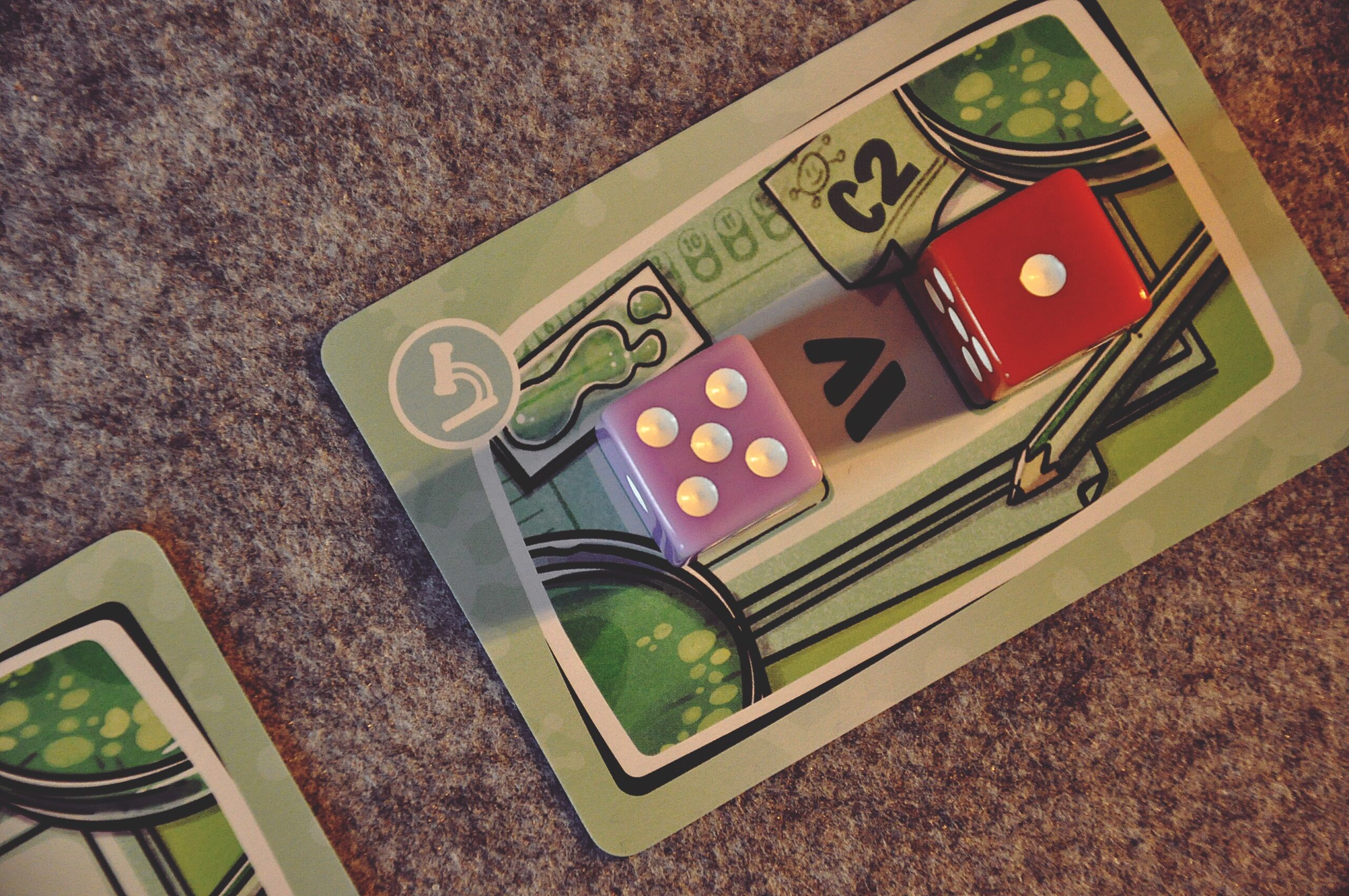 Drugą opcją jest położenie kości na karcie laboratorium. Te mają konkretne wymagania, które warunkują to jakie kości mogą się na nich znaleźć. W momencie gdy wszystkie pola na kartach laboratorium są zajęte, gracze którzy się tam dołożyli zamazują jeden z bonusów jakie wyszczególniono na arkuszu. Może to być pozyskanie jokera na przyszłą turę lub darmowe zamazanie dowolnego pola w sekcji chorób. Jeśli nie możemy położyć nigdzie naszej kości lub nie chcemy, musi ona trafić na kartę skażonych próbek. Gracze na koniec rundy zyskują tyle ujemnych punktów ile oczek ma kostka w ich kolorze na tej karcie.
